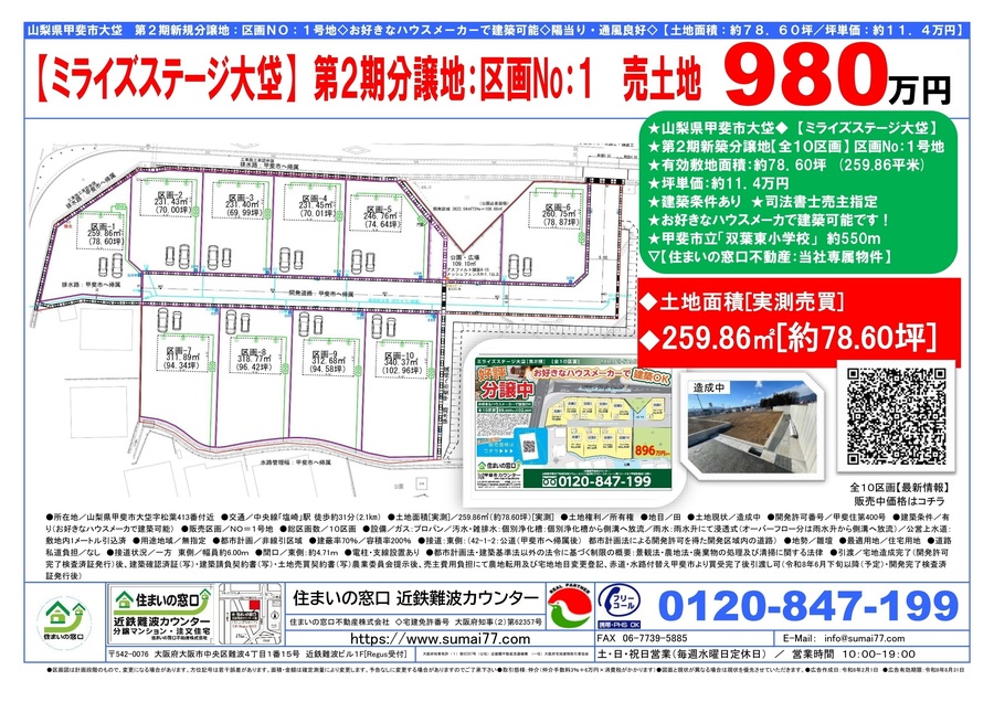 山梨県甲斐市大垈『ミライズステージ大垈』【第2期新築分譲地【全10区画】区画1号地
